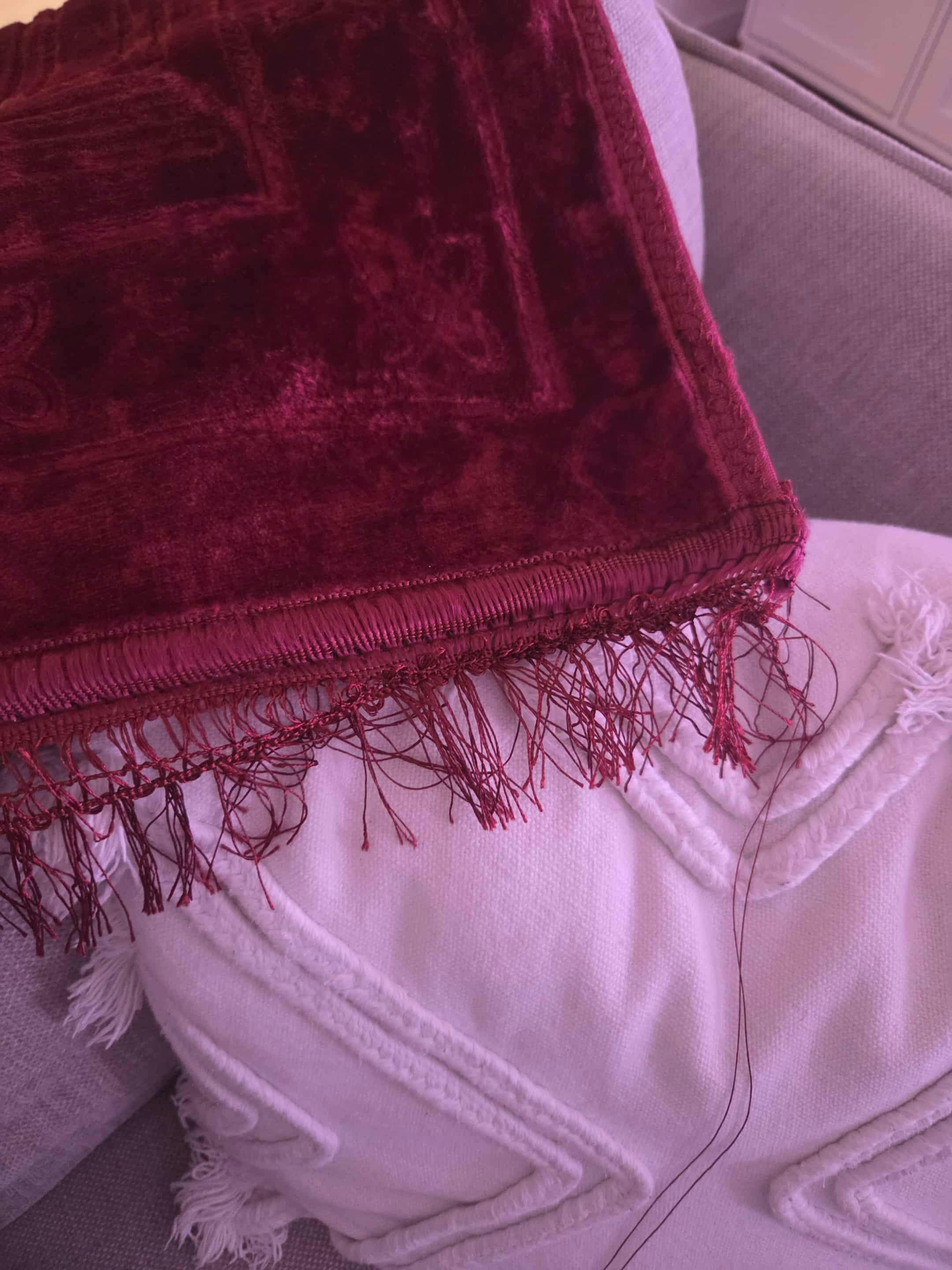 En stilren, enfärgad bönematta med diskret mönster som hjälper dig fokusera under bönen. Den extra tjocka designen ger komfort för knäna, medan den mjuka sammeten och halkfria undersidan håller mattan på plats.
