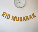 Dekoration att hänga upp med texten "Eid Mubarak" i glittriga guldbokstäver. Varje bokstav är 14,5 cm hög. Bokstäverna monteras på ett vitt band, med hjälp av en medföljande plastnål, och kan fästas på väggen med t.ex. häftmassa eller häftkuddar, eller knytas upp med hjälp av bandet.