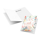 Blommiga gratulationskort med texten "Eid Mubarak" på framsidan, blank insida