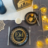 Pappservis i svart med text Eid Mubarak, för den stora festen med många gäster.