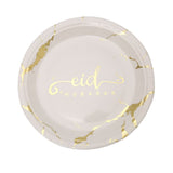 Engångstallrik designad för Eid-firande, med en elegant vit bakgrund och gyllene detaljer i form av texten “Eid Mubarak” och mönster som påminner om guldstänk. Tallriken är en del av ett festligt dekorationstema som används under Eid för att skapa en högtidlig och stilren atmosfär vid bordsdukningen.