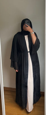 An Open Chiffon Abaya with Elegant Draping. A loose belt in matching material to tie around the waist is included.