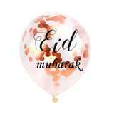 Funny transparent balloons with confetti inside and the text Eid Mubarak.